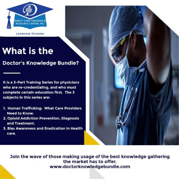 Direct Care Training & Resource Center, Inc. is uniquely positioned to provide the best in continuing education for physicians. Our close connection to the community, combined with years of experience in various care settings, enables us to deliver comprehensive and relevant training in critical areas such as Human Trafficking, Implicit Bias, and Opioid Addiction. By offering these essential training programs through our convenient portal, www.doctorknowledgebundle.com , we make it easier for physicians to stay informed and enhance their practice. Our commitment to excellence and community well-being drives us to equip physicians with the knowledge and skills they need to make a meaningful impact on their patients and the broader community.